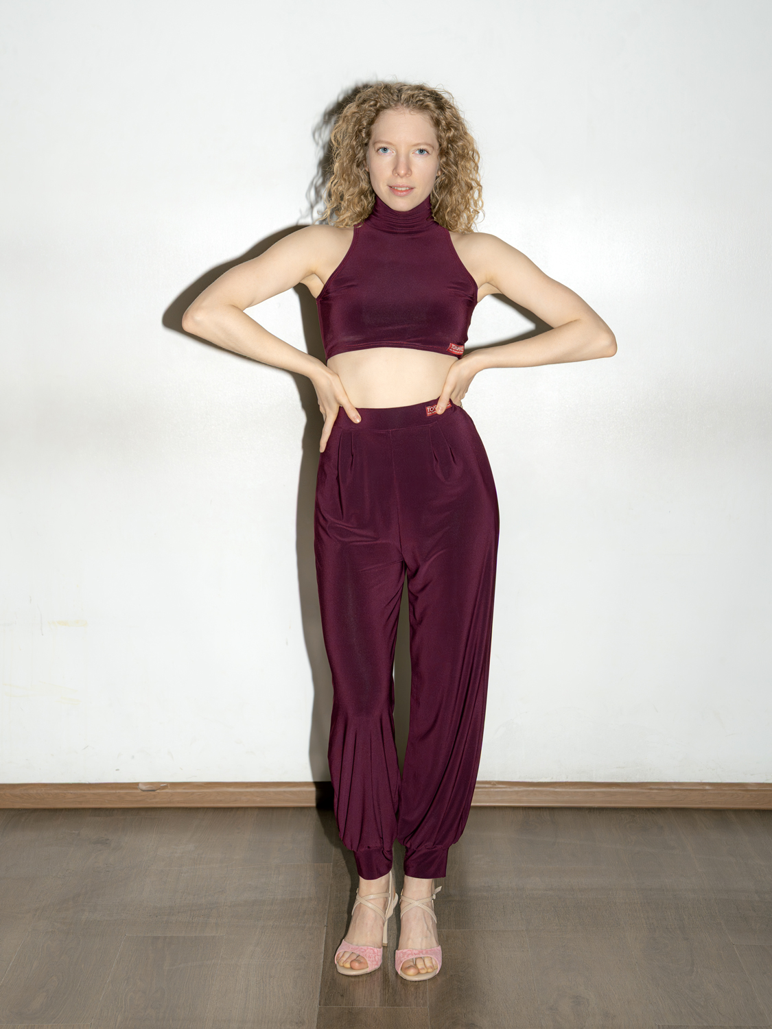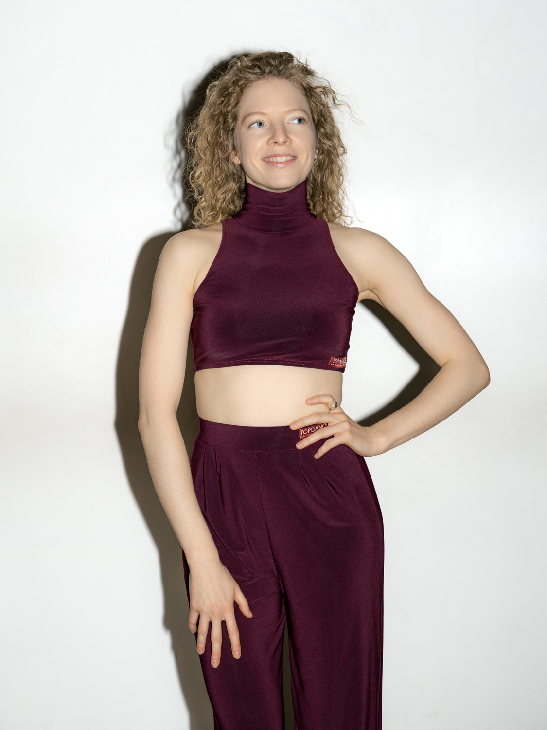 Этот трикотажный кроп-топ для танцев со вшитыми чашками с американской проймой смотрится оригинально и интересно! Топ подчеркивает красоту плеч и рук, делает образ женственным и притягательным. Высокое горло визуально удлиняет шею и стройнит силуэт. Облегающий топ хорошо сочетается с объемным низом: широкими брюками и расклешенными юбками.