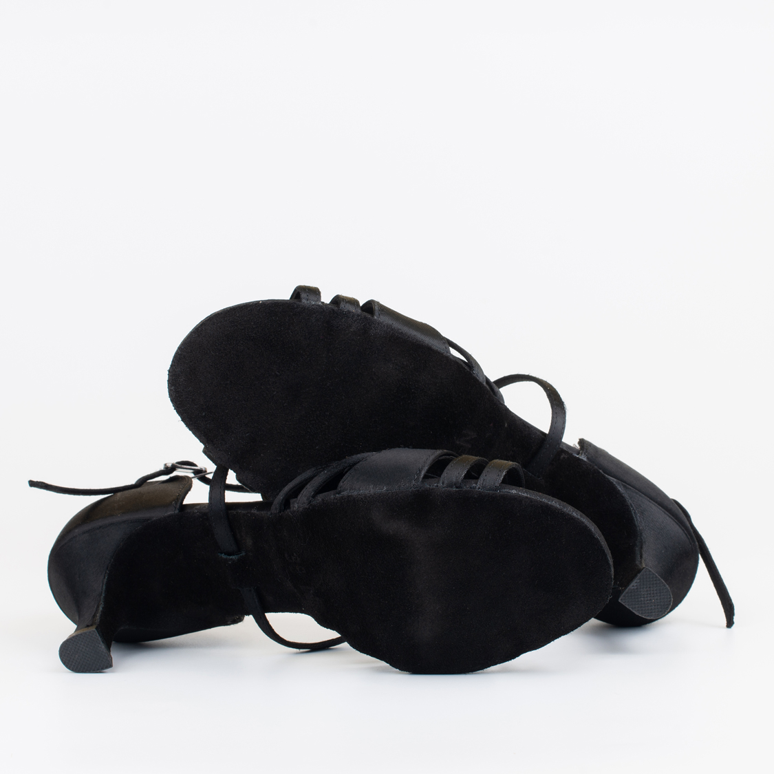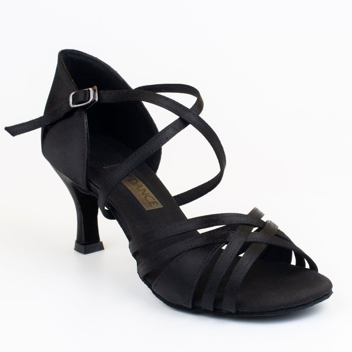 Танцевальные туфли для латины выполнены из блестящего черного сатина — универсального материала, который легко сочетается с любым образом. Модель удобно фиксируется на стопе благодаря переплетающимся ремешкам и хорошо подходит для средней и более широкой полноты стопы. Устойчивый расклешенный каблук высотой 6 см обеспечивает комфорт и уверенность в движении, а ворсистая подошва создает надежное сцепление с паркетом и помогает контролировать каждый шаг во время танца.