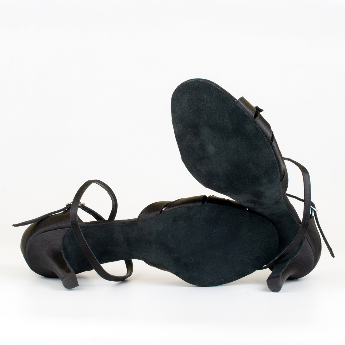 Туфли ручной работы для латины выполнены из черного блестящего сатина: глубокий оттенок и перелив ткани эффектно смотрятся на паркете при любом освещении. Каблук, обтянутый тем же сатином, создает цельный, аккуратный силуэт. Благодаря регулировке на носке можно точно настроить посадку по полноте стопы, а ремешки надежно фиксируют ногу во время быстрых вращений, акцентов и резких смен направлений. Ворсистая подошва обеспечивает уверенное сцепление с паркетом, а устойчивый каблук 7 см делает каждый шаг точным и выразительным.